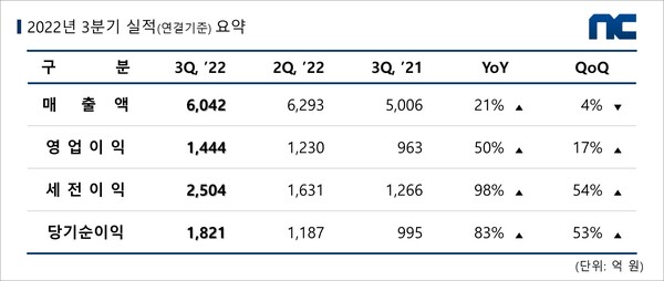 엔씨소프트가 2022년 3분기 실적 결산(이하 연결기준) 결과 매출 6042억원, 영업이익 1444억원, 당기순이익 1821억원을 기록했다.