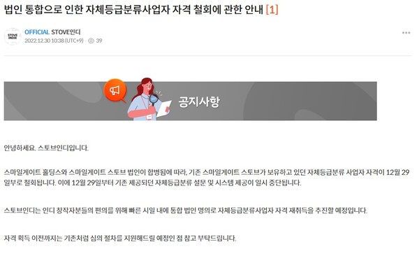 스마일게이트스토브의 글로벌 인디 게임 플랫폼 ‘스토브(Stove)’가 자체등급분류사업자 자격을 일시적으로 상실했다. 스마일게이트스토브가 스마일게이트홀딩스에 합병되면서 법인이 사라졌기 때문이다.