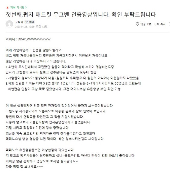 이와 함께 당시 상황이 담긴 영상을 근거로 제시했다. 운영자가 정확한 근거도 없이 자신을 핵(비인가 프로그램) 이용자로 단정짓고 제재를 가했다는 게 골자다.