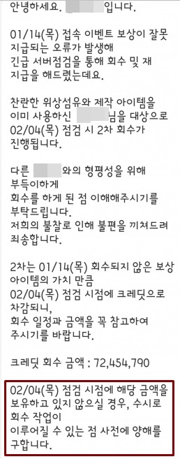 텐센트는 24일 공지사항을 통해 “일부 이용자들이 잘못된 보상을 받은 것을 확인했으며 문제를 즉시 해결했다”고 밝혔다. 해당 이용자의 재화 사용을 일정 기간 동결시키는 한편, 잘못 지급된 보상을 회수하겠다는 설명이다. 이 조치는 며칠 뒤 완료됐으나, 실제로는 미처 다 쓰지 못한 쿠폰만 회수되고 구매한 상품은 그대로 남아 있는 것으로 알려졌다.