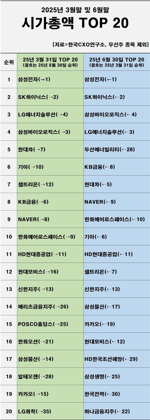 시총 상위 20위권에서는 5곳이 신규 진입하거나 탈락하는 등 큰 변화가 있었다. 두산에너빌리티(28위→5위), HD한국조선해양(29위→17위), 한국전력(30위→19위) 등이 새롭게 20위권에 진입했다.