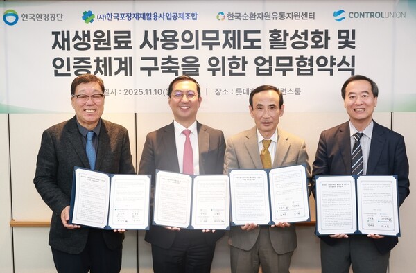 정부 정책 확정과 동시에, 산업계와의 ‘간극’을 메우기 위한 실질적 공조 시스템도 가동했다. 지난 10일 한국환경공단(관리), 한국순환자원유통지원센터(공급), 컨트롤유니온코리아(인증)으로 구성된 기존 3자 협력체에, 재생원료 수요자이자 법적 의무 이행 주체인 포장재재활용사업공제조합이 합류하면서 4자 업무협약이 체결됐다.