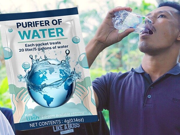 4g 1포로 최대 20L를 정수할 수 있다. 정수 방식은 간단하다. 오염수에 정수제를 넣으면 흙·유기물·중금속까지 흡착해 큰 플록을 형성해 침전시킨다. 침전물이 아래로 가라 앉으면 상층부의 투명한 식수를 얻을 수 있다.
