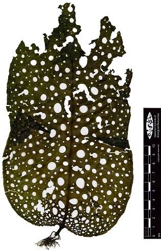 구멍이 송송 뚫려 있는 미역. 소위 '구멍쇠미역(Agarum clathratum)'이라고 불리는 해초류다. 일부에서는 '야기시리 구멍쇠미역'이라고도 불리는 종이다.