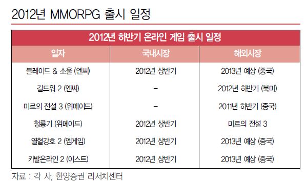 한양증권은 "MMORPG 장르의 특성상 개발 기간이 다소 길고 캐주얼 게임 대비 대규모 자금이 소요되는 점으로 인해 출시가 지연되면서 지난 몇 년간 시장 분위기가 다소 정체된 점은 사실"이라며 "그러나 내년은 B&S, 디아블로3 등 글로벌 탑 업체 게임을 포함한 다수의 신규 게임출시로 MMORPG 장르 증훙기가 될 것"이라고 내다봤다.